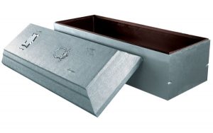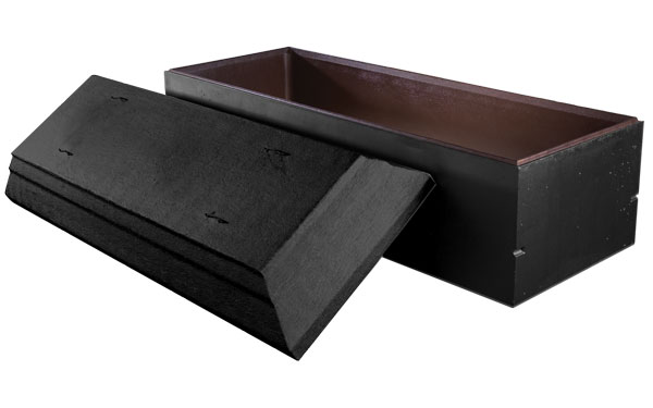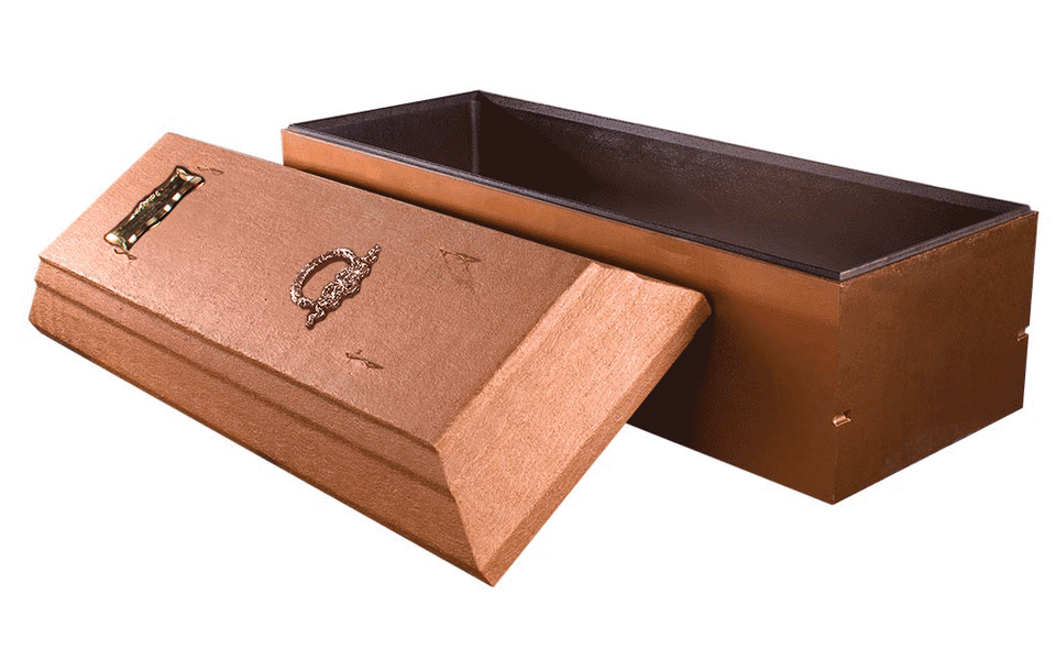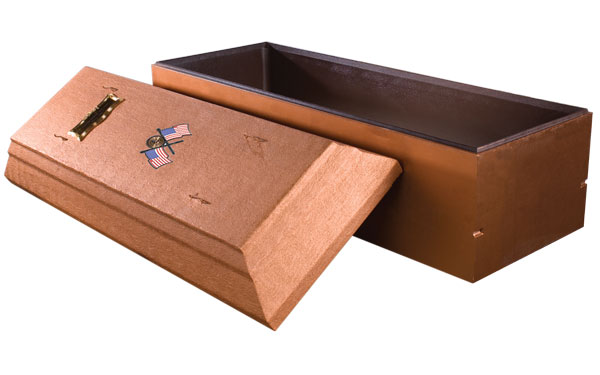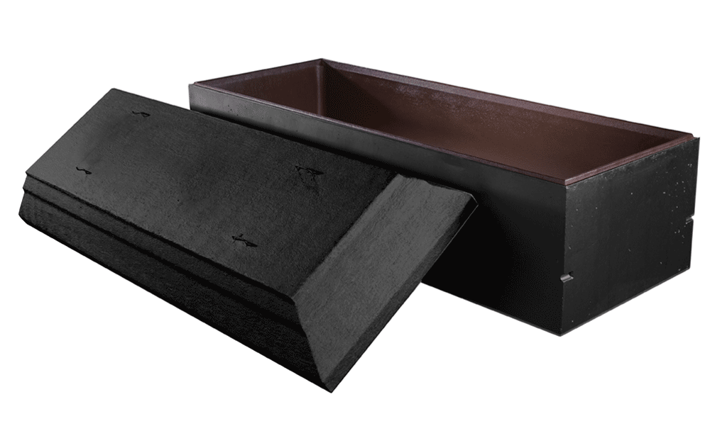 It is a concrete reinforced vault with arched cover and tongue and groove design with tape seal and Trigard’s thermoformed polymer liner. The exterior is hand-painted and can be personalized with a nameplate.