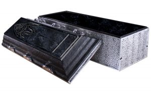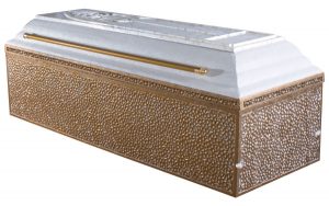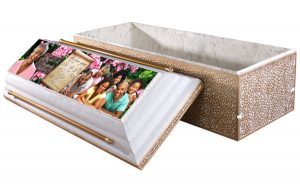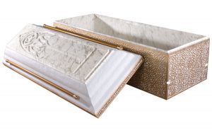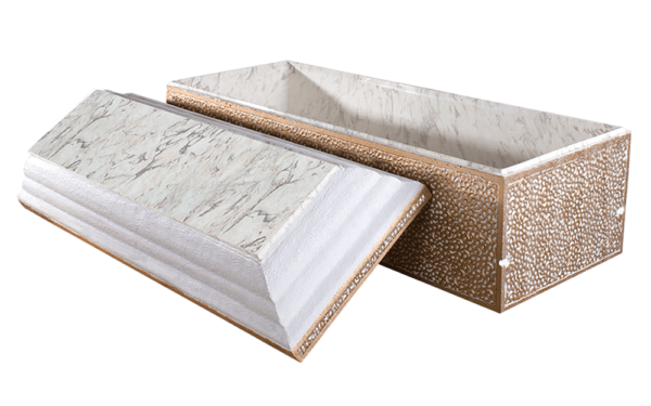 Each vault is hand-painted, such as gold and white. You can choose a simulated white marble, black marble or gray granite finish with a flat stone or a raised church window design.