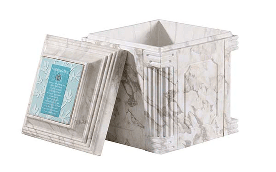 The Healing Tree is designed for the White Marble* Aegean Urn Vault cover. The textured plate is designed with the special poem and a ring for the family to take home as a keepsake. For families who desire more than 20 Memory Rings, a Remembrance Bowl and additional rings are available. Poem cards come with a ring and are available in Spanish.
